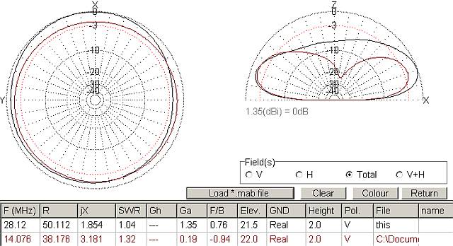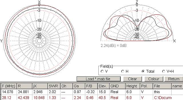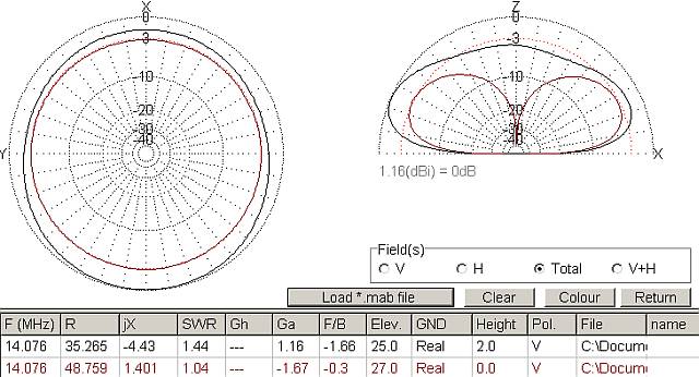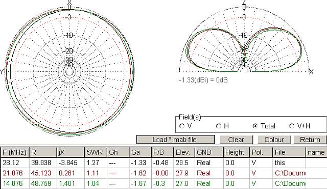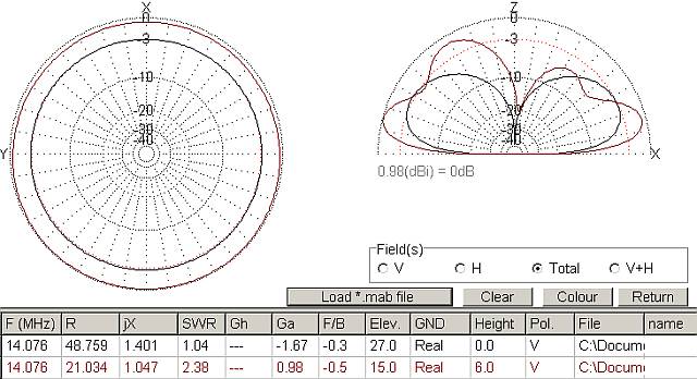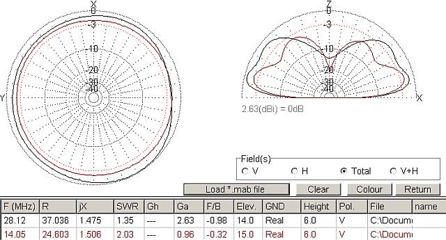 K anténě ve výšce h=6 metrů byly připojeny pro pásmo 20 metrů 4 radiály, které byly téměř vodorovné a pod nimi byly 4 radiály ve tvaru "fan", tj. šikmé, ale dostatečně vzdálené. Vyzařování je vidět z tohoto diagramu: