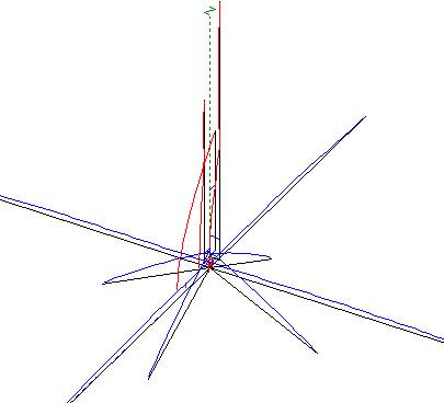 Závěry k finální instalaci Finální instalace nebyla dokončena, anténa měla realizovány pouze 4 radiály pro pásmo 20 metrů a 4 fan radiály pod nimi pro pásmo 10 metrů. V uvedené instalaci jsem byl schopen pouze přesně zaměřit závěsné body radiálů a udělat model. Podle tohoto modelu by měla anténa vyzařovat nějak takto: