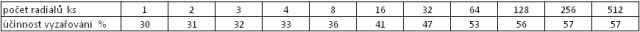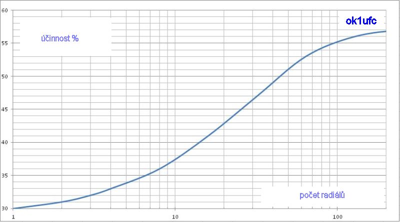 Jako kdybych byl na jiném pásmu. Některé evropské stanice zmizely, ty, které zůstaly jsou slabší, ale hlavně stanice z Chile, Brazílie, USA jsou silné, v čase pokusu byly slyšet s reporty od -4 dB (Brazil). Takže i proto, po zkušenostech z provozu, mám názor, že prohřešky u vertkálních antén jsou častější v jejich směrovosti než v účinnosti. Až budu mít vyrobený druhý prototyp, pokusím se ukázat, že ve stejný čas bude anténa na louce a bez radiálů skutečně na reportech jen o ty dva dB horší, hi. Vliv počtu radiálů, geometrie radiálů a vlastností země má tedy zásadní vliv a to na směrovost a účinnost antény. V tomto článku píšu o relevantním vlivu na účinnost a to u antén, které mají zaručeně dobrou směrovost. O anténách, které mají nějaké prohřešky vůči směrovosti (tady jim říkám "špatné vertikály") píšu mimo jiné také ve druhém článku o vertikálech: http://www.ok1ufc.cz/vertikaly_2.htm. Měli bychom si však dát odpověď na otázku, zda bude vertikál chodit bez radiálů, jak bude chodit s několika radiály a s mnoha radiály. V článku http://www.ok1ufc.cz/nec_3.htm jsem publikoval informace, které uvádím i zde, v dalším odstavci. Vliv počtu radiálů na účinnost čtvrtvlnného vertikálu Někde v zahraniční literatuře jsem četl, že dobrý počet je 120 radiálů. Modeloval jsem v modelu NEC a vyšlo mi, že přibližně nad tento počet radiálů se mi už účinnost vertikálu dále nezvyšovala. Počítal jsem až do 4096 radiálů. Můj vertikál má teď zakopaných už 32 radiálů a tak bude asi o 10 % méně účinnější, než lze teoreticky docílit. V grafu jsem to znázornil tady.