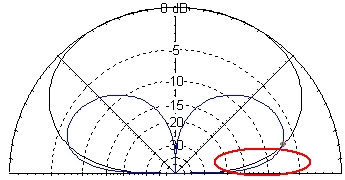 Pozn.: Často je v literatuře uváděn rozdíl ve prospěch dipólu. Ano, takový rozdíl existuje, ovšem pro dipól ve výšce, která je minimálně rovna polovině délky vlny. Pro nízké dipóly to neplatí. Bohužel. Prohřešků ve směrovosti se dopustíme u vertikálů snadno. Např. nepovedenou zemní rovinou z radiálů. Když to ještě nedopadne nejhůř, vypadá to nějak takto: