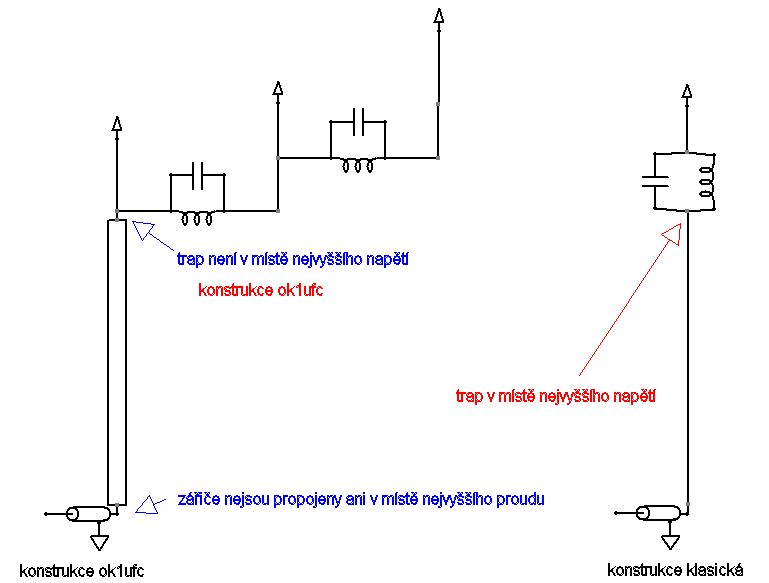 Na obrázku vlevo je průběh proudů naprosto nevhodně navrženého vertikálu pro více pásem, než lze zrealizovat s použitím tohoto principu. Na obrázku vpravou je vidět průběh proudů u vertikálu, který celkem slušně funguje (80/40/30 m), buzeno na f= 10.12 MHz. Opět je vidět, jak jsou vybuzené zářiče pro nižší pásma... Trapy slouží jako selektivní výhybka k tomu, aby u vertikálu netekly proudy vyšších frekvencí do části, které mají vyzařovat na nízkých frekvencích. Princip je tedy dán a nejjednodušší vertikály klasických konstrukcí toto dodržovaly téměř doslovně. A získaly tím nikoliv nejlepší pověst a vznikla celá řada mýtů o ztrátách v takových anténách. V současné době lze snadno navrhovat jakékoliv obvodové řešení a jakoukoliv anténu pomocí vhodného a důmyslného SW vybavení. Ale fyzikální principy je třeba dodržovat. Osobně preferuji trapované antény, ale navrhuji je nepatrně jinak, než je obvyklé. Moje nové generace trapovaných antén využívají principu, který je zřejmý z tohoto obrázku: