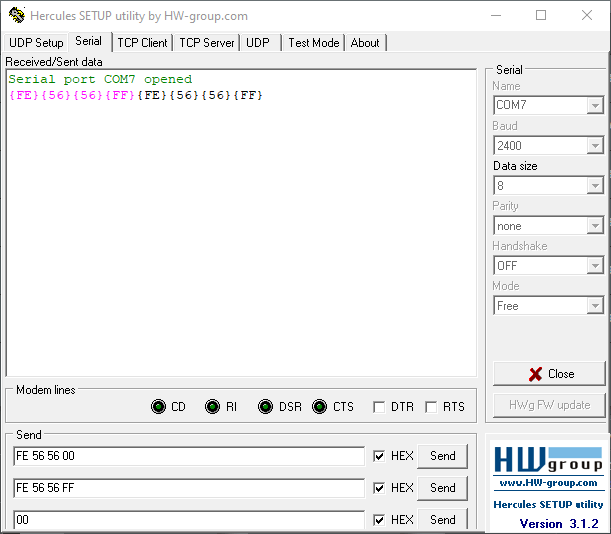 hexadecimálním formátu a odeslal jsem čtyři bajty. Na obrazovce se