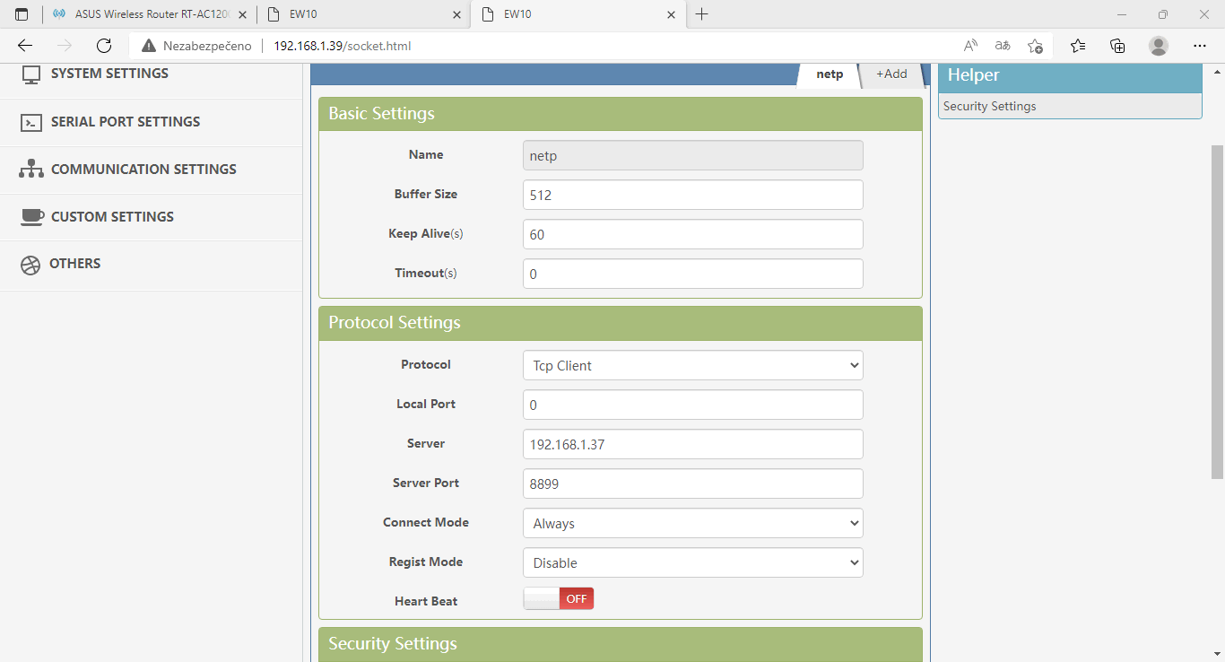 kterém server naslouchá (8899). Dále se vyplní Connect Mode (Always
