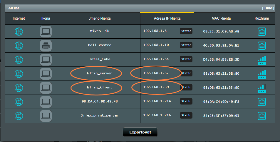 Elfinům pořád stejnou IP adresu. Na mém routeru jsou oba Elfiny vidět