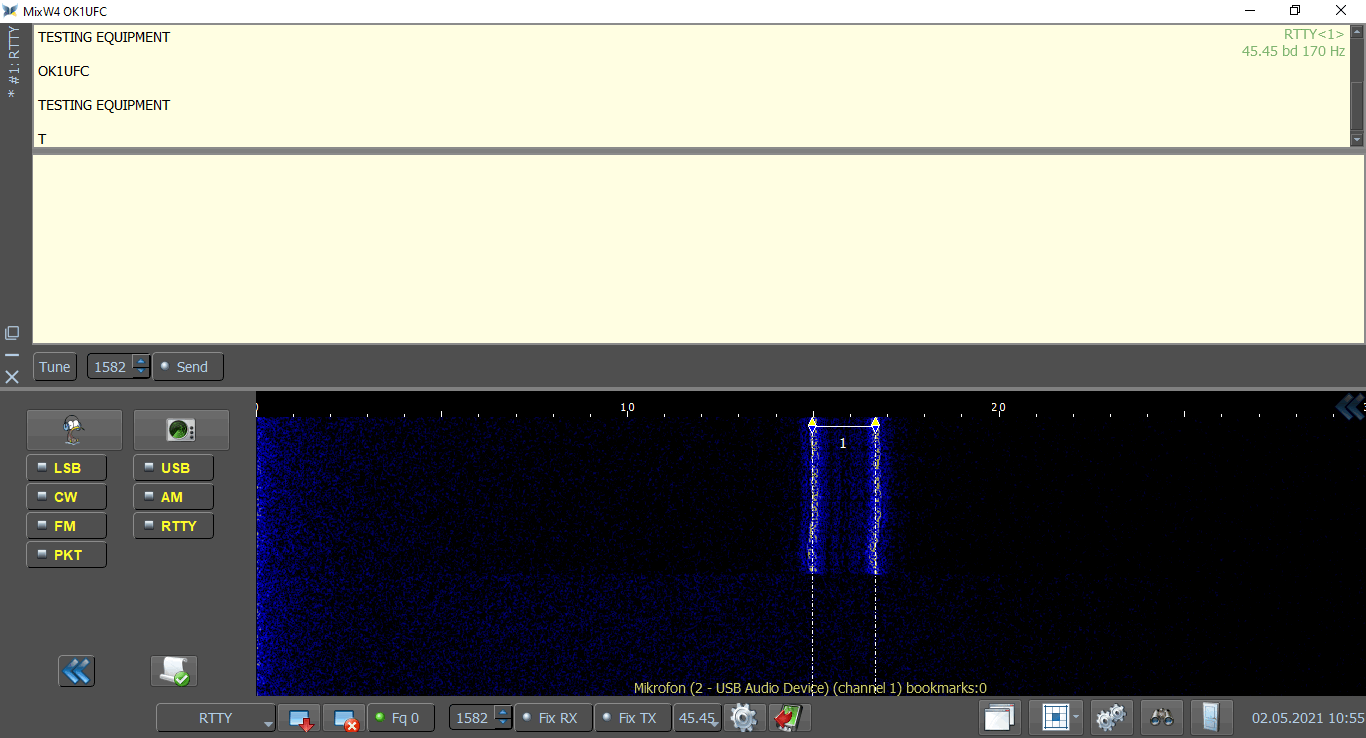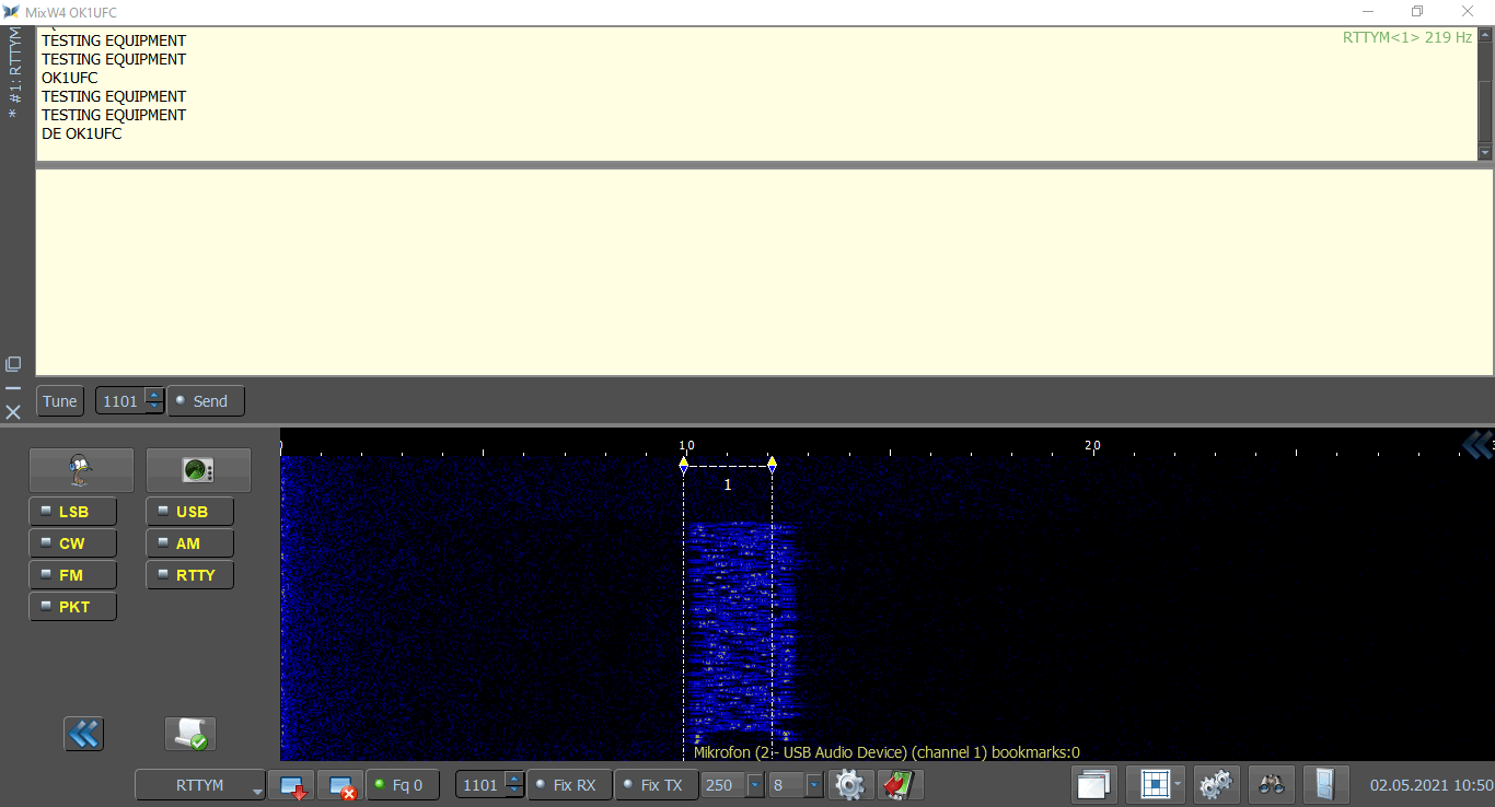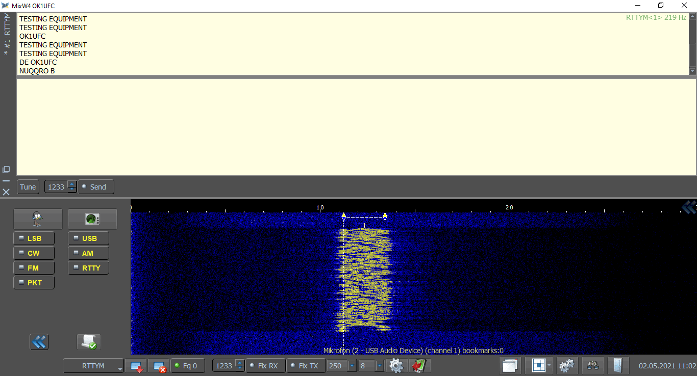 s úplně slaboučkým signálem, na ten dojde, až se něco naučíme. Takže jsem vyzkoušel, mimo standardního RTTY rovněž RTTYM,