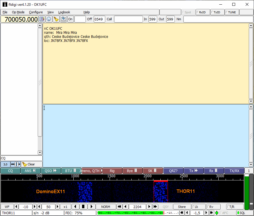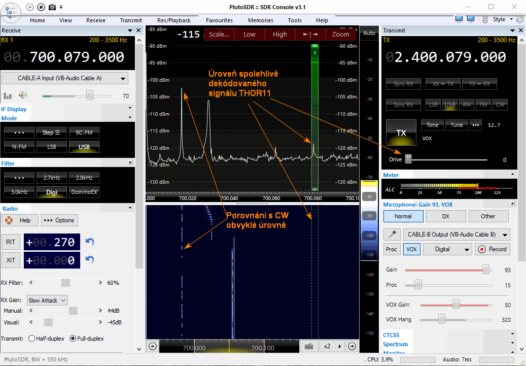 THOR je velice robustní mód, který umožňuje opravdová QRPP spojení. Ve spektru SDR Console snadno přehlédneme komunikující stanice. Na obrázku jsem zachytil spolehlivě dekódovaný signál THOR11. Všimněte si, že jeho úroveň je o 15 dB menší, než signál stanice pracující CW: