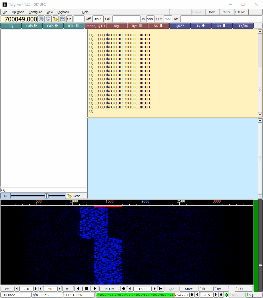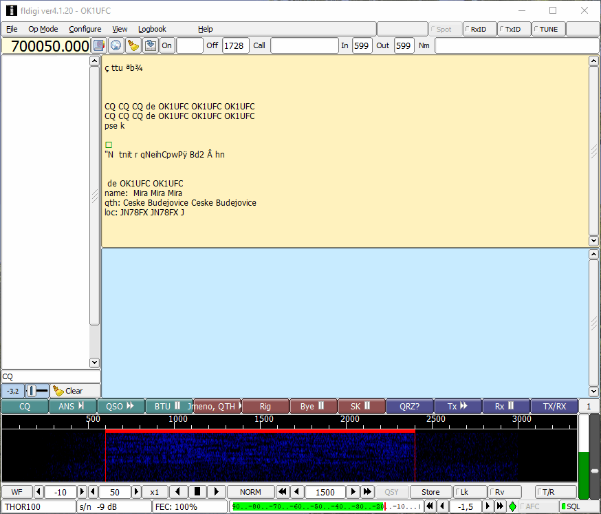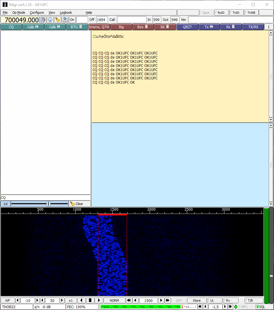 Pokud vysílám do QO-100 s úrovní, která odpovídá módu FT8/FT4, potom spolehlivě dekóduji přijímané signály THOR22, který využívá spekra širokého asi 400 Hz. Nízký požadavek na přesnost naladění je fascinující. THOR22 si poradí se skokovou i se spojitou změnu frekvence a signál je dekódován beze ztráty znaků. FEC si ukazuje spolehlivě svých 100%, vodopád je krásně viditelný a zelený sloupcový ukazatel ukazuje neuvěřitelnou rezervu nad nastavením squelche. Fascinující:
