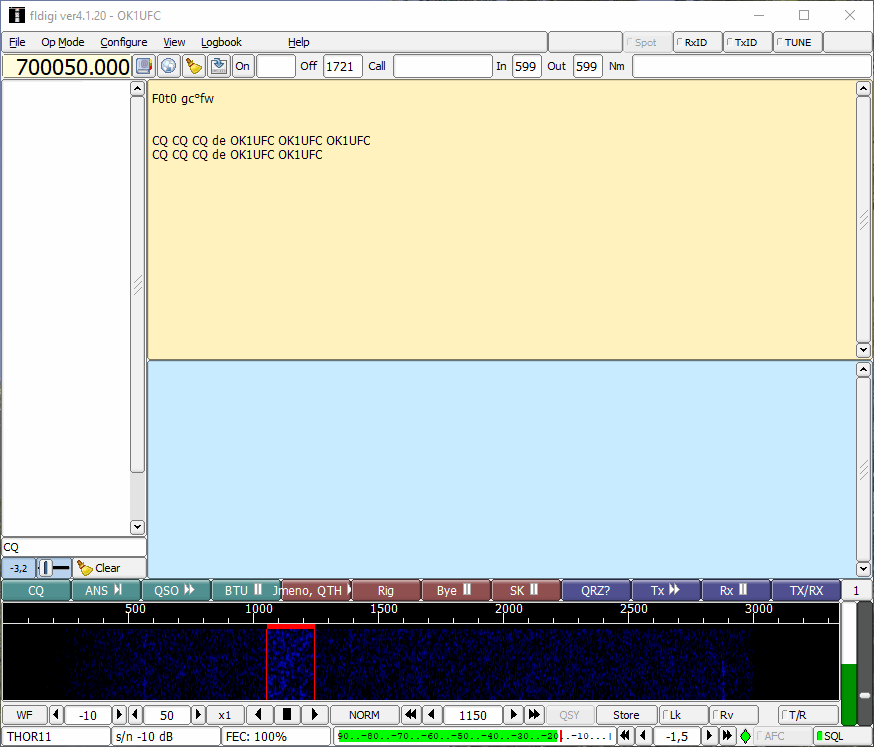 Na následujících obrázcích jsou snímky obrazovek módů THOR11 a THOR22. Signál byl vysílaný s úrovní nastavenou pomocí Drive = 0, viz obrázek SDR Console, tedy nepatrný výkon (100 mW@40cm dish, V polarizace):
