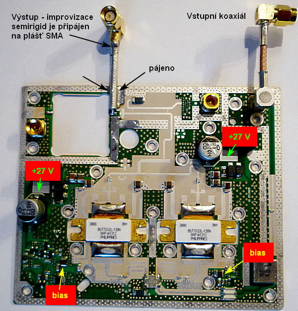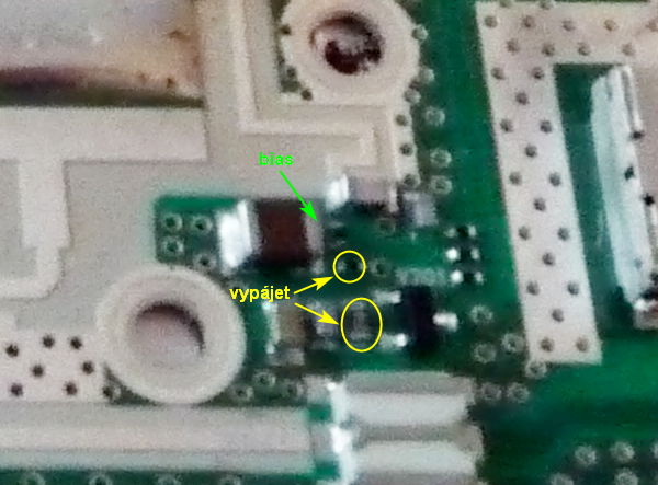 Vstupní konektor jsem použil původní a signál přivádím modifikovaným okonektorovaným kabelem. Původní kabel jsem rozpůlil a na druhém konci okonektoroval SMA. 2. Výstupní konektor Druhý konec je pájen přímo k desce, v místě demontovaného výstupního cirkulátoru. 3. Napájení DRAIN Místa, kam lze přivést napájecí napětí + 27 V jsou označena na fotografii. 4. Napájení bias LDMOS Zapojení k tomu určených obvodů desky neznám. Proto jsem použil osvědčené obvody bias, jejichž zapojení jsem převzal z katalogových listů Infineon a popsal zde http://ok1ufc.nagano.cz/UHF_Small/BIAS_inf/Bias.htm. Jen provedení desky zde mám odlišné (co dům dal...). Kvůli externímu zdroji bias bylo nutné odstranit rezistory, které propojují vedení s původními obvody desky. Foto dole. Napětí pro bias se přivádí na SMD kondenzátory větších rozměrů. Mezi těmito kondenzátory a napájecím vedením bias je rezistor 10 Ohmů SMD titěrných rozměrů. Na mé desce byl jeden poškozený. Nahradil jsem ho rezistorem velikosti 1206 v jiném místě. |