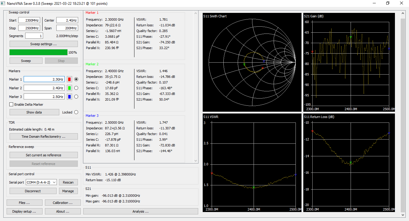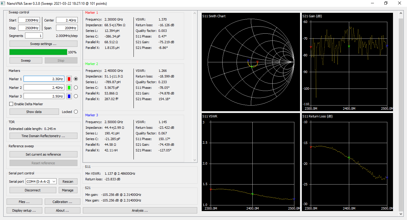 Princip ladění výstupních obvodů PA jsem popsal na konci tohoto článku. Výstupní obvod PA Nokia byl přizpůsoben celkem slušně. V celém rozsahu kmitočtů byl poměr stojatých vln VSWR lepší, než 1.5 a na pracovním kmitočtu bylo VSWR asi 1.27: |