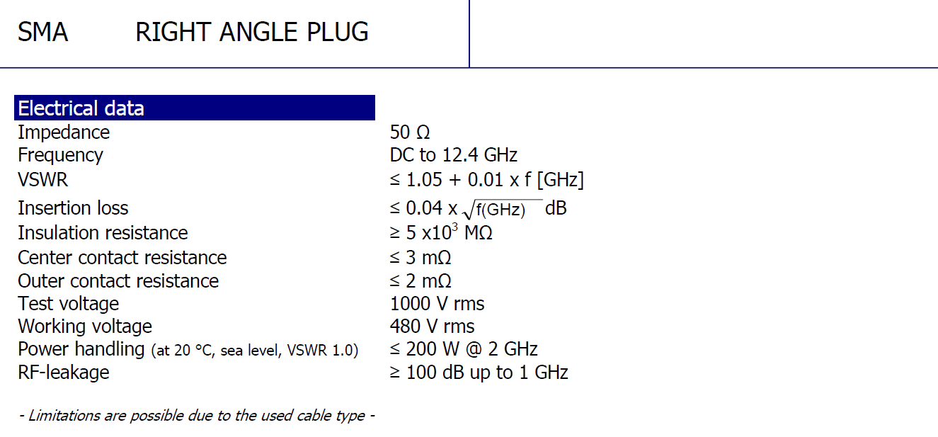 Srovnání přímého a úhlového konektoru z elektrického hlediska SMA konektory firmy Rosenberger považuji za výborné a mají garantované elektrické parametry. Pro mě je velice zajímavé srovnání parametrů přímého a úhlového (90°) konektoru. Dovolím si povšimnout rozdílů v parametrech. Přímý konektor je určen pro kmitočty do 18 GHz. Úhlový pouze do 12.4 GHz. Přímý konektor SMA od Rosenbergera má Return Loss vždy vyšší, než 30 dB, u úhlového je vyjádřen VSWR. Za domácí úkol si cvičně vyjádříme, jaký je RL na 10.368 GHz a na jakém kmitočtu je RL menší, než 20 dB. (Mě vyšlo, že RL (10 GHz) = 22.4 dB a kmitočet pro RL menší, než 20 dB je cca 16 GHz): |