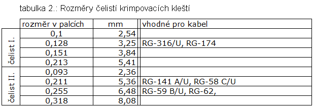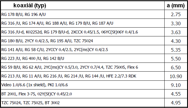 Rozměry šestihranů pro běžné typy koaxiálních kabelů jsem