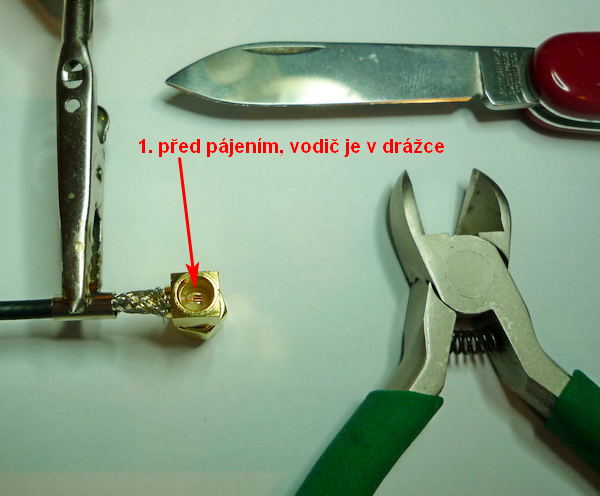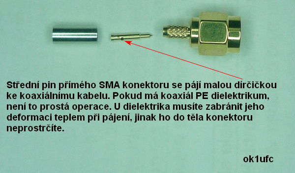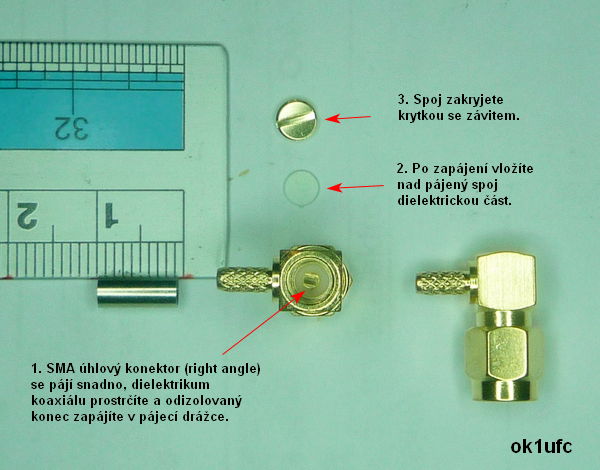 Úhlové SMA konektory na koaxiál Úhlové SMA konektory na koaxiál nemají tak dokonalé vlastnosti na nejvyšších kmitočtech (18 GHz), ale na nižších kmitočtech doceníme jejich neméně důležité vlastnosti: 1. Snadnou a rychlou montáž. Ten fígl spočívá v tom, že dielektrikum koaxiálu se středním vodičem normálně prostrčíte dírou z boku a odizolovaný konec vodiče založíte do drážky ve středním vodiči konektoru (foto vpravo). Přístup s letovačkou a pájkou je snadný, takže shora snadno přiložíte, zapájíte a můžete rovněž vizuálně spoj zkontrolovat. Po zapájení vložíte na spoj kruhovou dielektrickou izolaci a spoj zakryjete krytkou se závitem. I když se dielektrikum PE kabelu nepatrně deformuje, v trubičce těla konektoru zůstává nedeformované. Konektor používám jak na teflonové kabely, tak na kabely s