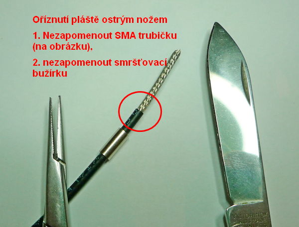 1. Ruční úpravu provádím vždy, když nemohu použít nebo nemám po ruce vhodný stripper. Dále ji preferuji u kabelů, které využívají stejné velikosti konektorů, ale mají rozdílné průměry vodičů. Bohužel, často používám kabely o průměrech d = 1.8 mm až 2.8 mm (RG-174 EMOS s jedním typem SMA konektoru. Nemám na každou velikost kabelu seřízený stripper a tak úpravu dělám ostrým nožem, chirurgickými ostrými nůžkami a štípacími kleštěmi. Na dalších fotografiích je zaznamenán postup. Na fotografii je vždy zobrazen použitý nástroj. 2. Oříznutí pláště ostrým nožem. Nezapomeneme před prací na koax nasadit smršťovací trubičku (pokud ji chceme použít) a kovovou trubičku SMA konektoru. Řez provedeme opatrně ostrým nožem a přebytečný materiál pláště odstraníme. 3. Délku stínění upravuji na délku SMA trubičky. Používám k