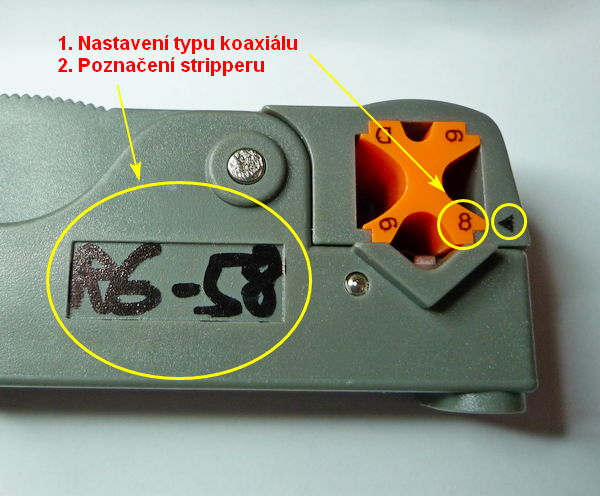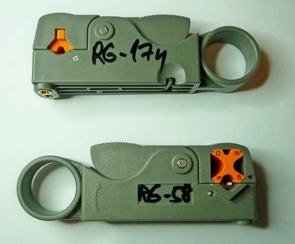 1. Před montáží SMA konektorů je třeba upravit koaxiální kabely pomocí nástroje, kterému se říká stripper. 2. Je dobré, abychom tuto činnost uměli také ručně, s pomocí ostrého nože, chirurgických nůžek a dalších drobných pomůcek. Ručně to opravdu jde. 3. Stripper je na obrázku vpravo. Mám jich několik, seřízených na často používané typy koaxiálních kabelů, konkrétně na rozměr RG-58 foam a na rozměr RG-174 EMOS. 4. Na mých stripperech se nastavuje typ kabelu vysouvacím voličem kabelu. 5. Seřízení nožů stripperu není úplně triviální, chviličku toto seřízení trvá. Vždy se spotřebuje kus drahého kabelu, než jsem s řezem spokojen. 6. Proto používám stripper pro konkrétní kabel, který mám ve větším množství a pro kabely středních a větších rozměrů.