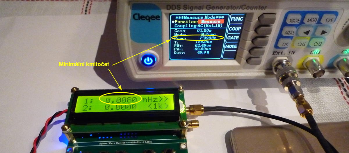 Základní rozsahy přístroje Počet výstupních kanálů: 2, každý samostatně nastavitelný (frekvence, nikoliv úroveň) Maximální kmitočet: 150 MHz Minimální kmitočet: cca 8 kHz (u obou vzorků) Výstupní úroveň cca +7 dBm, fixní, nelze nastavovat vnějšími tlačítky Napájení: USB konektor, 5 V DC Specifické vlastnosti: Pokud není kmitočet nastaven, generátor si generuje asi 550 kHz nestabilního kmitočtu se stejnou výstupní úrovní