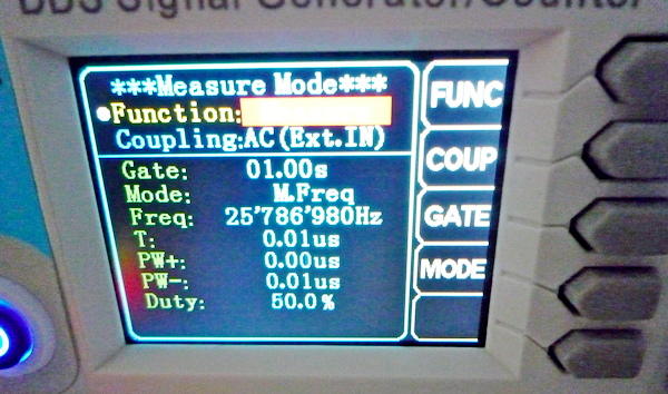 generátor není osazen oscilátorem TCXO, pouze krystalem Orientační měření kmitočtu Generátor by měl v uvedeném nastavení generovat kmitočet 25.7871 MHz. Realita byla: