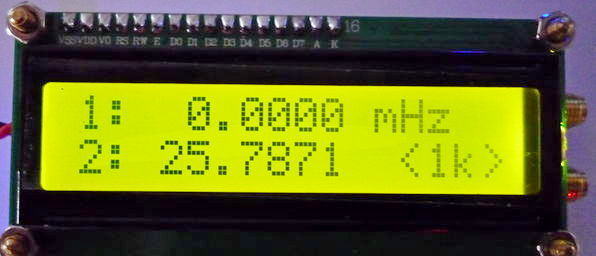 Úprava generátoru Si5351 Použitý oscilátor Si5351 byl upraven tímto způsobem: 1. Nastavím kmitočet č. 1 (25.7871 MHz) a stisknu tlačítko