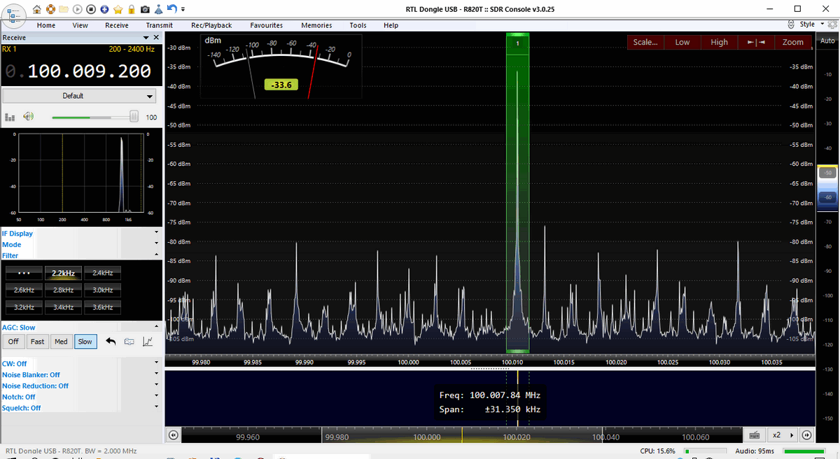 Spektrum signálu Na poslech slyšíme z RX čistý tón. Pomocí klíčenky RTL-SDR naměříme toto: |