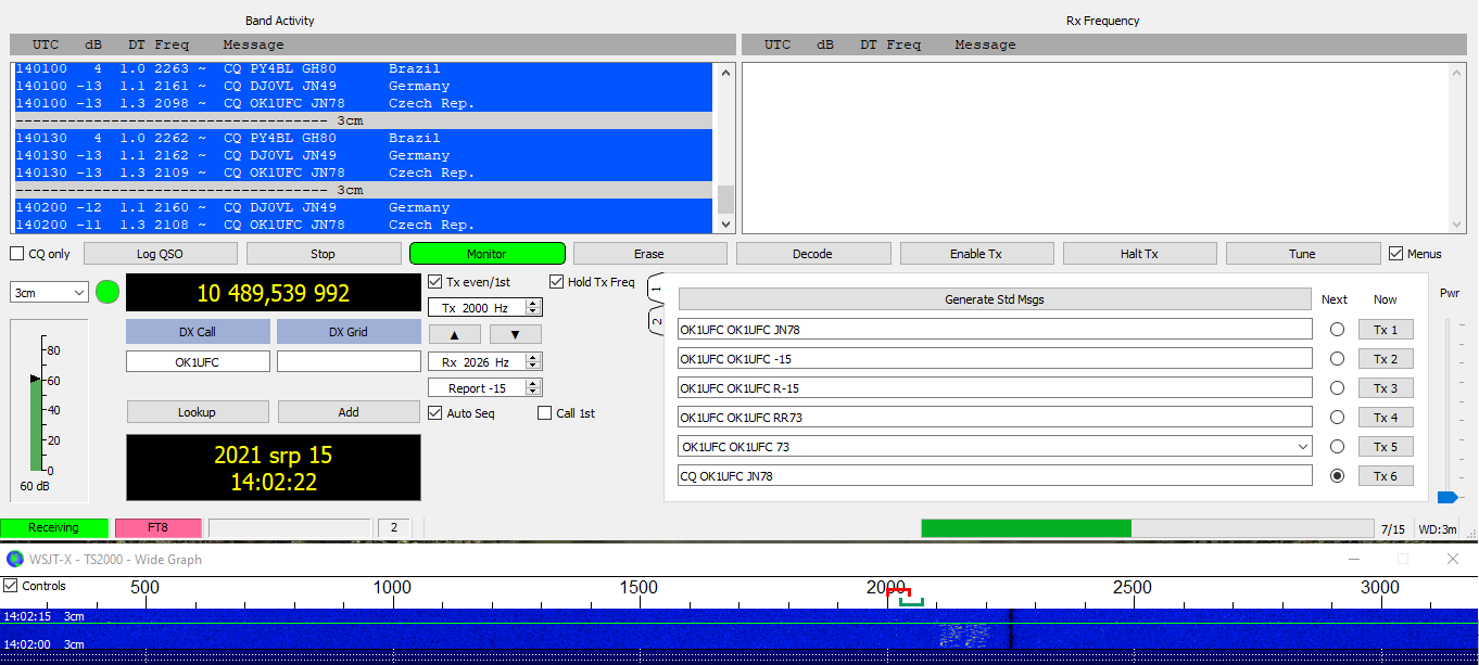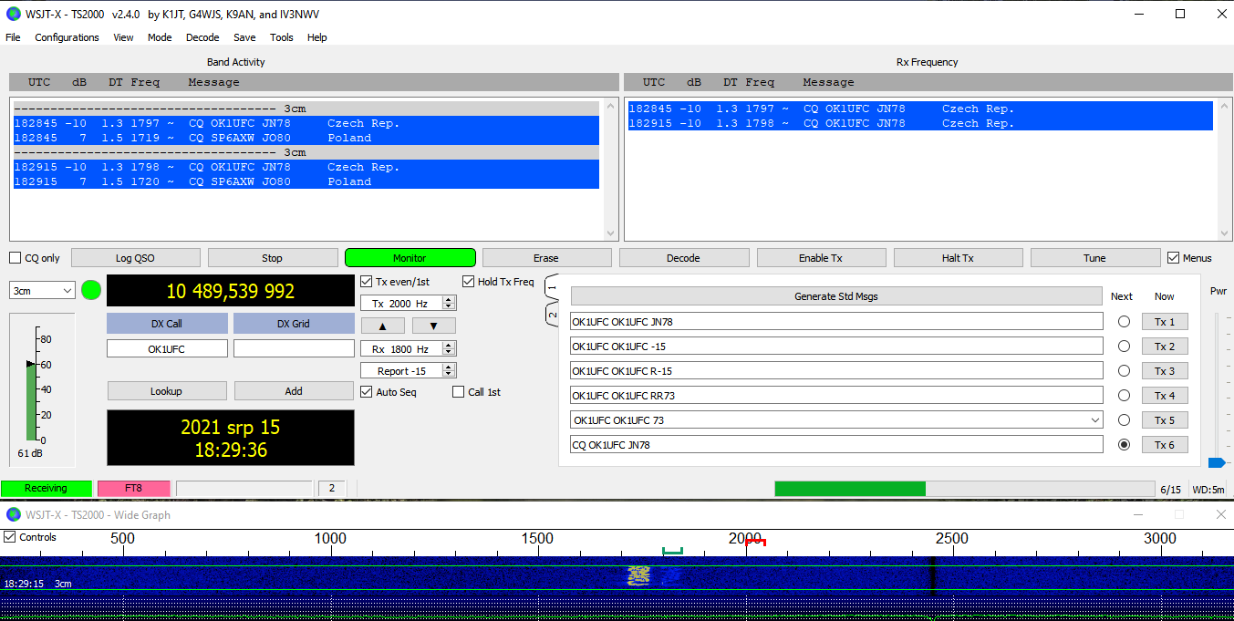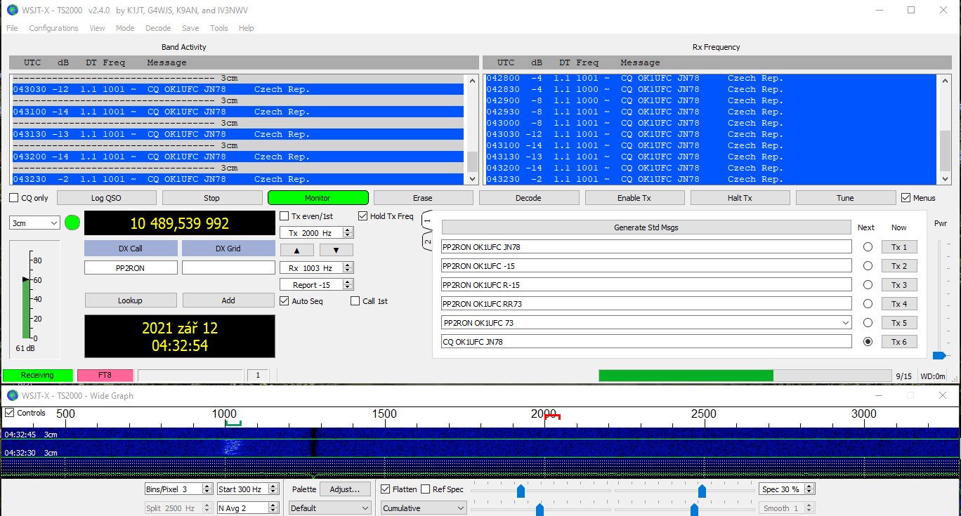 Proč miluji FT8? Protože umožňuje v jedné relaci přenést krátkou zprávu (jedno, dvě slova), ve spektru čistý signál zanechá jen tenkou čáru, asi 30x slabší, než je tlustá čára SSB hlasového kanálu a pro dokonalou čitelnost by tedy při stejném odstupu signál/šum měl stačit 30 x menší výkon. Jedna relace se přenáší pouze 15 sekund, což netrvá dlouho. Celé spojení tak lze zvládnout do dvou minut, ovšem za předpokladu, že relace přenesou zprávy spolehlivě, tj. bez nutnosti je opakovat. Tomu říkám FB FT8 QSO. Za jakých podmínek lze zrealizovat FB FT8 QSO? Stačí na to QRP výkon? Pokud není transpondér příliš obsazený, spolehlivě dekódujeme signály