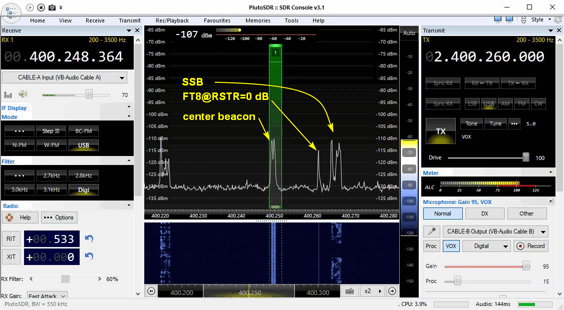 Co nazývám malou stanicí ... Mám malou stanici pro provoz na NB QO-100. Stanice je založena na SDR transceiveru Adalm Pluto, obsluhujícím programu SDR console a využívá malých parabolických antén. Přijímám na offsetovou parabolu o průměru 40 cm a vysílám na středovou 40 cm parabolu pro WiFi s ozařovačem Andrew instalovaným pro vertikální polarizaci. S tak malou RX anténou jsem schopen slyšet šum NB transpondéru QO-100 od šumu, který mi generuje můj přijímač a signály s obvyklou sílou přijímám takto. Šipky ukazují na signál středního BPSK majáku, na můj signál FT8, který s mým RX dekóduji s přijatým reportem RSTR = 0 dB a signál SSB, který ve spektru nepřelézá sílu středního majáku. Tak pracuje a tak jsem definoval malou stanici pro provoz na NB QO-100: |