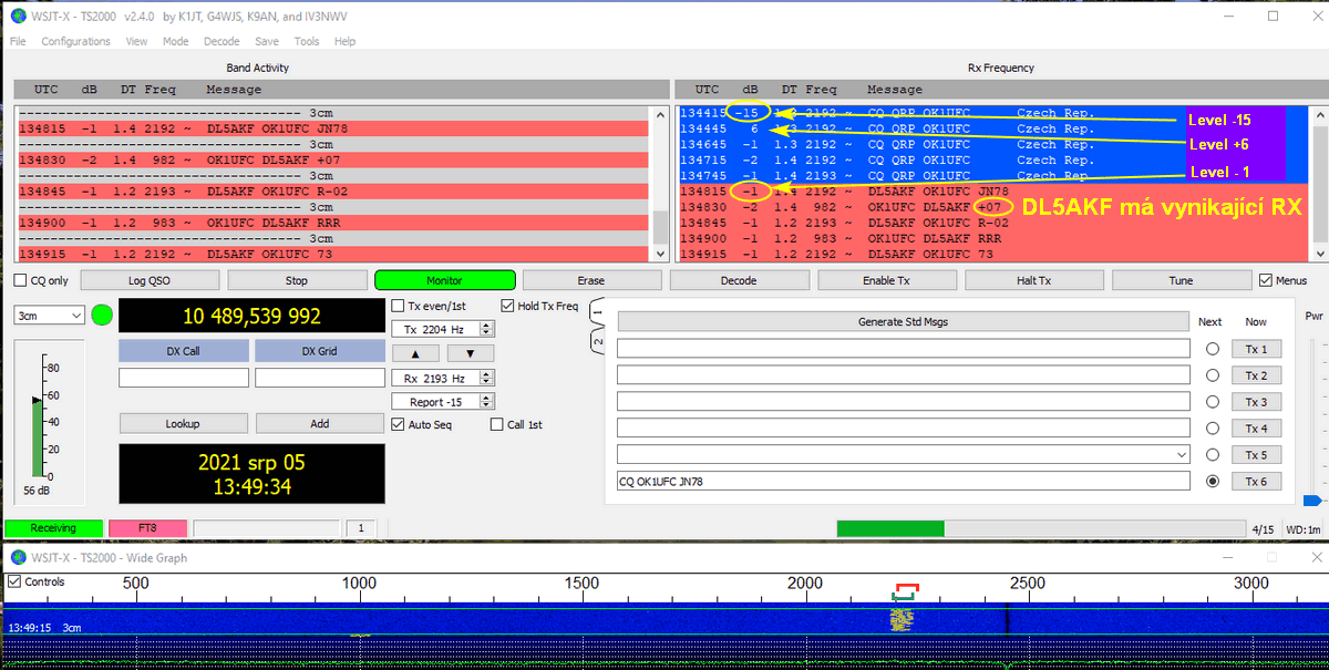 Experimenty a poděkování Technická zábava si vyžádala značné množství experimentů. Proto touto cestou děkuji operátorům stanic, kteří mi věnovali při realizaci spojení spoustu času a které jsem při experimentech možná i otravoval. Výbornou stanici má Pavel, OK1PHU. Přestože je vybaven QRO pro širokopásmové video aplikace, našel si čas na FT8 QRP spojení a s QRP úrovněmi opravdu pracoval. Zrealizovali jsme mnoho spojení. Za velké množství experimentů, které se týkaly hlavně ověření, kde je použitelná úroveň pro dekódovatelnost protokolu FT8 musím poděkovat Aldertovi, PH7PCF, který mi ochotně posílal printscreeny. Díky Aldertovi jsem prakticky ověřil, jaká je vhodná úroveň FT8 signálu např. při volání výzvy. Aldert rovněž miluje navazování a realizaci spolehlivých FT8 spojení s malými výkony a snažil se hledat technicky přijatelný RX a rozumnou hranici vyzářeného výkonu pro spolehlivá QSO. Zajímají mne stanice, které mají výborné RX a zpravidla spolehlivě dekódují slabé FT8 signály. U stanic dobře vybavených jsem takovou skutečnost očekával. Nicméně, zaujalo mě několik stanic, které mají vynikající přijímače, ale velikostí přesto patří ke stanicím menším. Takový setup má např. DL5AKF - viz printscreen s komentářem pod textem. Díky mnoha stanicím, které pracují FT8 na QO-100 se lze potřebným experimentům věnovat téměř v kterékoliv době. To je výborná věc. |
