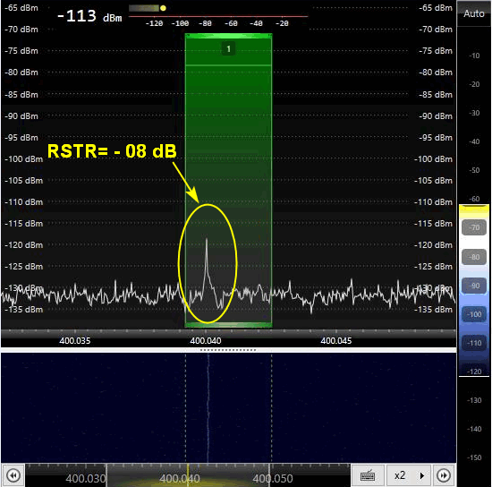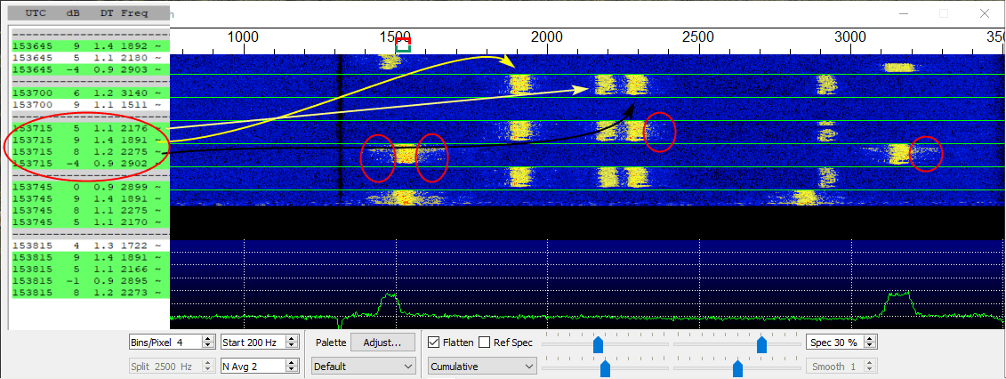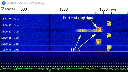 Když na pásmu nejsme sami ... Jiná situace nastane, když na pásmu nejsme sami. Provoz FT8 na QO-100 sleduji již několik měsíců pravidelně. Ke koloritu satelitního provozu od nepaměti patří aligátoři (prý to označení vzniklo od přirovnání k velké tlamě a malým ouškům aligátora). Aligátor nemá potřebu vysílat jen s takovou sílou signálu, která je potřebná k realizaci FB FT8 QSO. Proto běžně vysílá se signály s podstatně vyššími úrovněmi. Prosím, já tento fakt neodsuzuji, pouze konstatuji, jaké je prostředí. Transpondér satelitu je schopen celkem slušně regulovat zisk zařízení. Takže silné signály až tak nevadí. Pokud jsou extrémně silné, zasáhne Leila, sníží zisk podstatně a aligátora "označí" dvěma tóny kolem jeho spektra. Vyšší výkon neodsuzuji proto, že: - pokud je signál stanice kvalitní, ostatním signálům opravdu nevadí; To, co vadí, tak jsou nekvalitní a silné signály, které aligátor vysílá. Příklad spektra s nekvalitními signály jsem uvedl níže. Všimněte si, že některé signály jsou nejen (zbytečně) silné, v zelené tabulce vidíte RSTR od + 5 dB do + 9 dB. Raději jsem vymazal značky stanic, hi a slovo zbytečně jsem napsal do závorky. Možná, že pro stanice aligátorů nejsou zbytečně silné. Pro malou stanici se 40 cm parabolou, s laciným LNB a s nejlacinějším TCVRem Adalm Pluto jsou však silnější o 10 až 20 dB, než je pro FB FT8 QSO třeba. Poznámka: Ty silné signály jsou nekvalitní v tom, že produkují značně široké spektrum. Široké spektrum představuje rušení pro ostatní stanice, které pracují s protokolem FT8. Teoretická hodnota dekódovatelnosti RSTR = -18 dB platí pro rovnoměrně rozprostřený šum spektra, nikoliv pro silné spektrální čáry parazitních produktů.