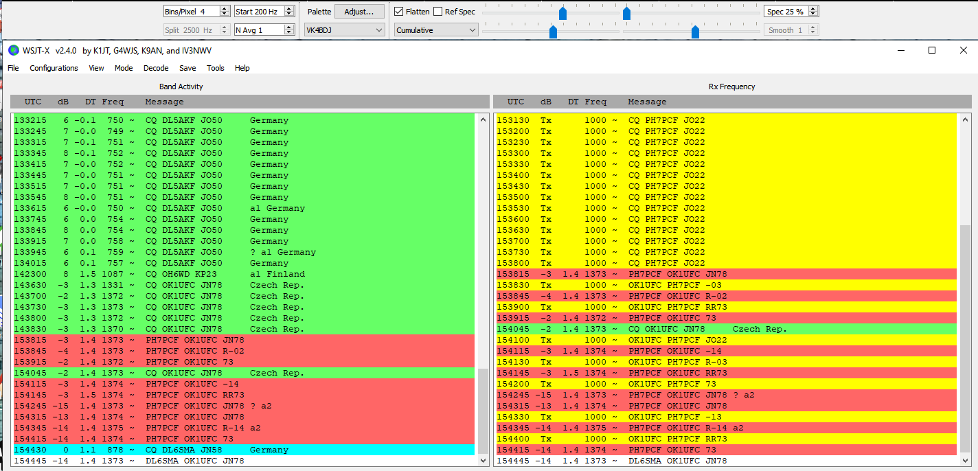 | Dva slaboučké signály blízko sebe si samozřejmě také nevadí. Snažil jsem se vysílat společně se stanicí DJ0VL svůj signál tak, aby potřebná šířka pásma obou signálů nebyla širší než 100 Hz. DJ0VL vysílal výzvu s RSTR = -12 až -13 dB. Já jsem svůj signál upravil a přiblížil se těsně k signálu DJ0VL. Vše fungovalo perfektně a nic nebrání realizovat FB FT8 QRP QSO. | |