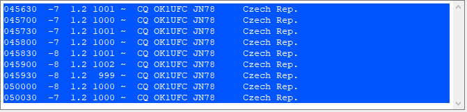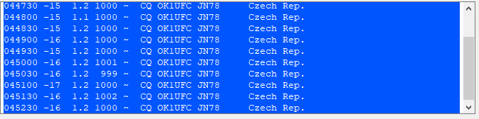 reportech Pro informaci jsou ještě níže dvě modré tabulky (z programu WSJT-X), které dokazují, že při reportech kolem RSTR = - 7 dB a dokonce při reportech RSTR = - 15 až -17 dB se mi daří opakovaně přijímat a dekódovat, a to ralaci po relaci FT8 signály s takovými reporty. Dokazuji, že pro realizaci FB FT8 QSO stačí tak malé výkony QRP, které nám na skromně vybavené malé stanici, s malou anténou o průměru do 40 cm, s laciným LNB (mám Zircon 101) umožní takový signál s požadovaným reportem RSTR do -18 dB.