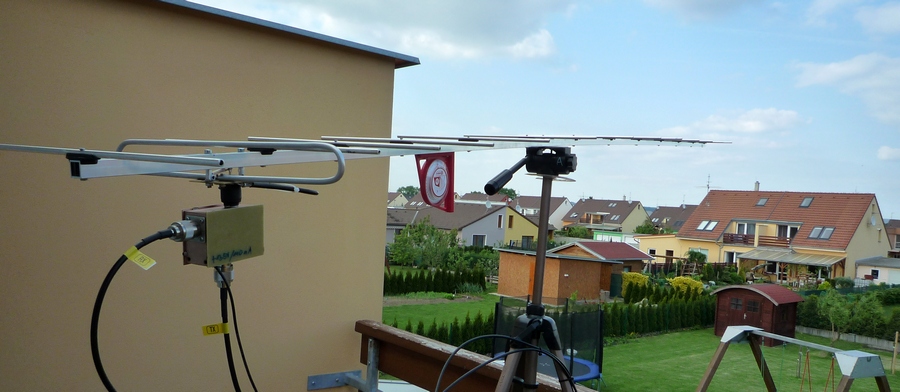 Pro pásmo 70 cm používám několik antén. Oblíbil jsem si cca 3 m dlouhou anténu yagi se skládaným dipólem. Předzesilovač (LNA) je přímo na konektoru zářiče. Anténu běžně přepravuji uvnitř auta (ještě se tam vejde). Pokud ji vezu na zahrádce, odšroubuji zářič i s LNA. Pro portable práci mám na anténě sklonoměr k měření elevace. A také vozím školní (pro malování na tabuli) úhloměr, abych mohl nastavit azimut.