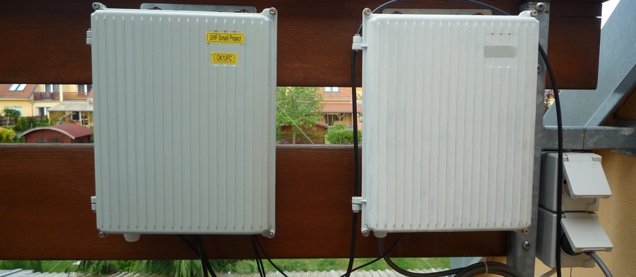 Vedle antény je levá outdoorová skříňka. Do hamovny vede jen jeden koaxiální kabel H155 (5mm) k TCVRu a jeden tenký RG174 pro PTT. Z outdorové skříňky vedou dva koaxiály H155 k anténě (RX a TX). Dále tenký koaxiál pro napájení LNA).