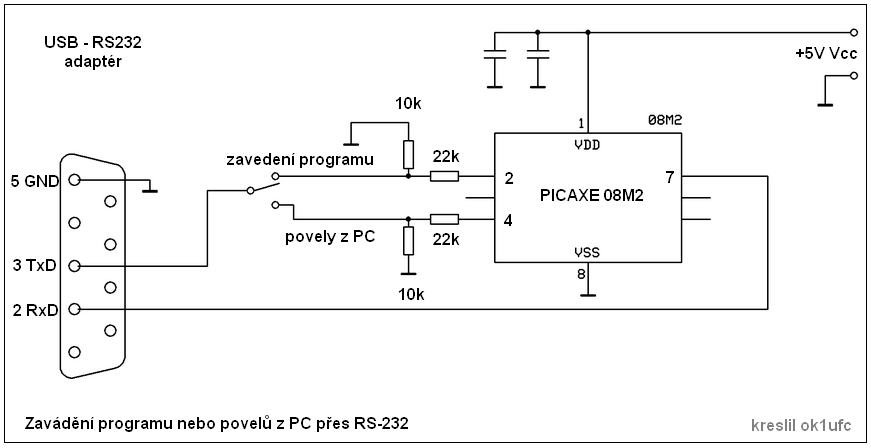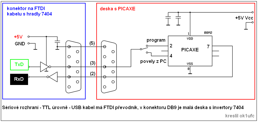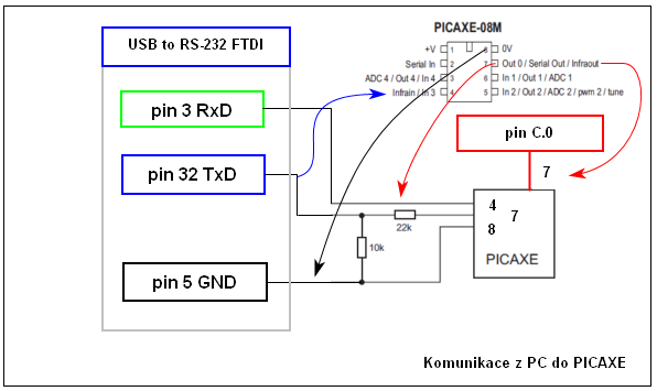 z PC. Piny nesmí být spojené (nefungují povely). Na straně PICAXE se v