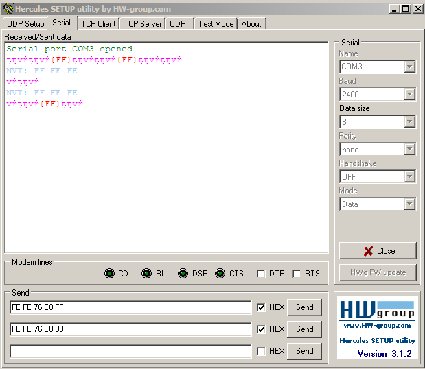 čtyři bajty: FE FE 76 E0, což znamená FE FE preambuli, 76 je adresa
