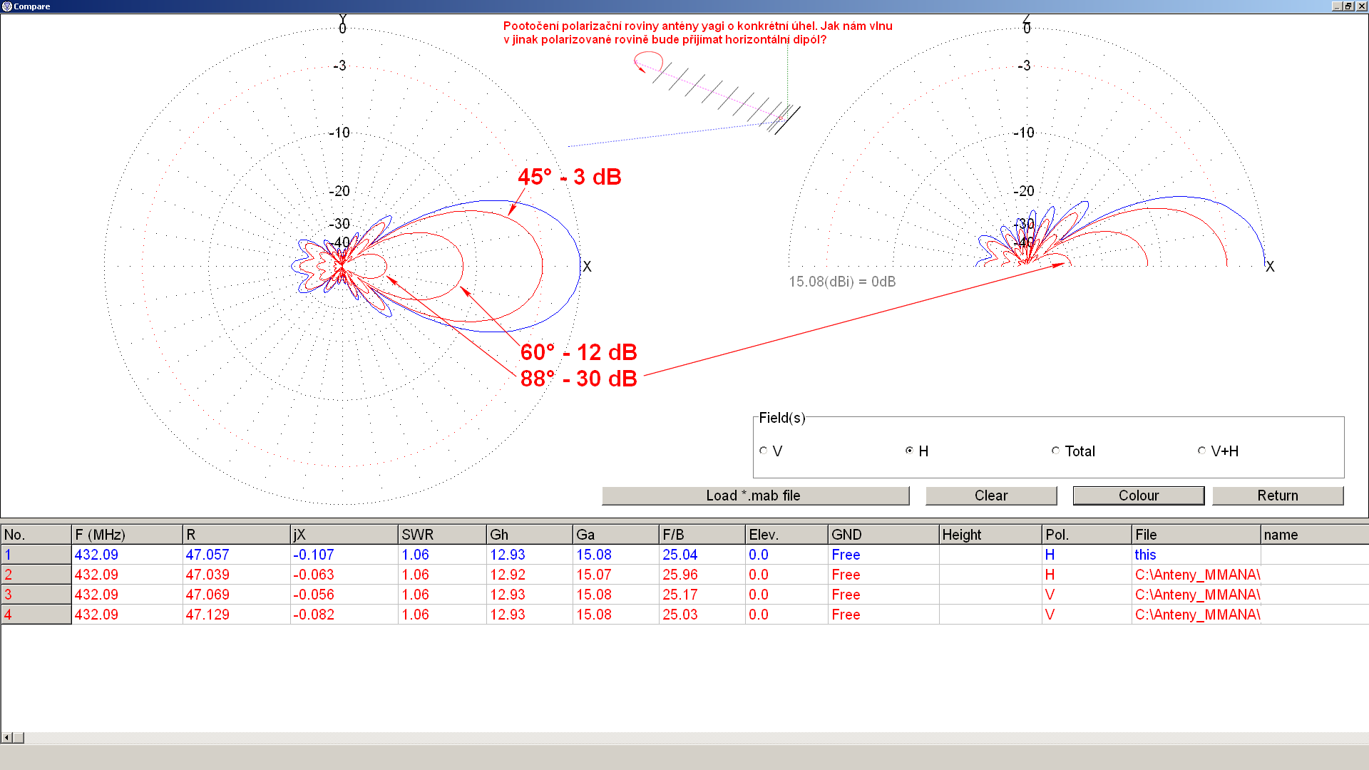 Anténa s horizontální polarizací vyzářila stejný výkon pomocí pole s