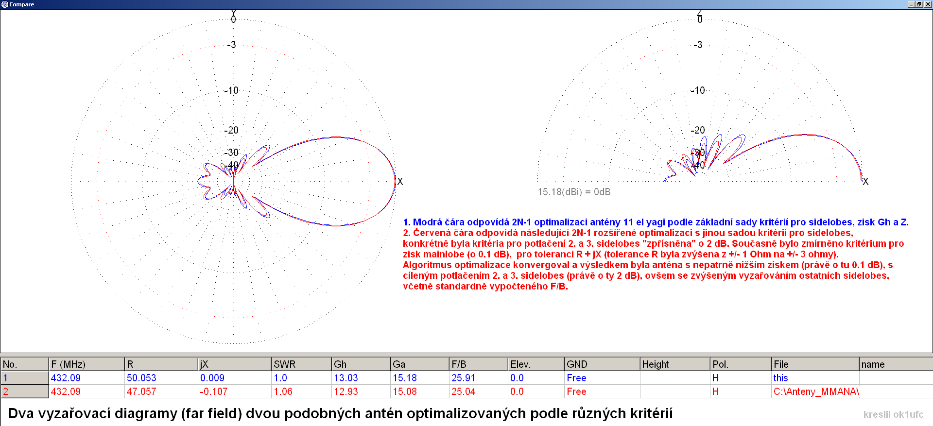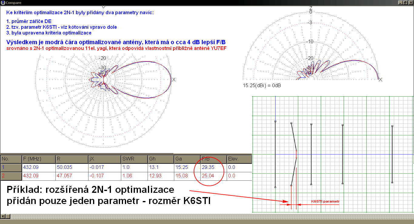Aby moje konání mělo nadále smysl, musím řešením docílit u optimalizované antény obvykle dosahovaného zisku (vůči dipólu - dBd, ve volném prostoru), což jsem označil jako parametr s číslem 1. Dalšími parametry jsou: šířka hlavního paprsku (ve stupních), úroveň a poloha postranních pásem a impedance na svorkách. Ta je velice důležitá, často se nám mohou jevit zajímavé antény s jinou svorkovou impedancí, kterou však musíme transformovat, tedy reálně počítat s tzv. match-loss ztrátami. Není dobré zařadit si match loss ztráty, byť v desetinách dB před Ultra LNA s šumovým číslem v řádu desetin dB. Tím můžeme celé naše snažení totálně degradovat. Proto považuji za nesmírně důležitý fakt uvažovat při návrhu antény o tzv. rozšířené optimalizaci. Za její výsledky, přestože neznám přesné metody výpočtu, považuji např. návrhy bent dipólu (Brian Beezley, K6STI, G0KSC design, blade dipól DG7YBN). Výsledky designu jiných autorů byly publikovány s využitím enginů NEC (NEC-2, NEC-4). Do parametrů rozšířené optimalizace tedy přidáváme (mimo 2N-1 délek a spacingu prvků) několik parametrů, které nám v NEC modelech popisují zářič (driven element). Např. jednoduchý drátěný model podle K6STI přidává jeden geometrický parametr navíc - viz dále. Jak prezentovat výsledky? Uvedu příklad výsledku optimalizace základní 2N-1 a rozšířené metody na anténu 11 el. yagi. Jde o ilustrativní výpočet, kritéria nebyla cíleně stanovena. V příkladu byla použita anténa délky kolem 2141 mm. Tato délka vyšla po základní optimalizaci výchozího DL6WU designu. Při další optimalizaci byla změněna kritéria pro první sidelobes. Podle modelu zhotovená anténa byla použita pro experimenty s příjmem EME v módu JT65B. Chtěl jsem si vyzkoušet, zda nějak poznám, že dříve optimalizovaná anténa má první dva postranní laloky ještě více potlačené o cca 2 dB. Při optimalizaci jsem dovolil snížení zisku maximálně o 0.1 dB, zvýšení tolerance impedance na svorkách maximálně o +/- 3 Ohmy. Na algoritmu jsem ponechal navýšení energie do vzdálenějších postranních laloků, neboť jsem neočekával zvýšení šumu odrazem od trávníku pod anténou:
