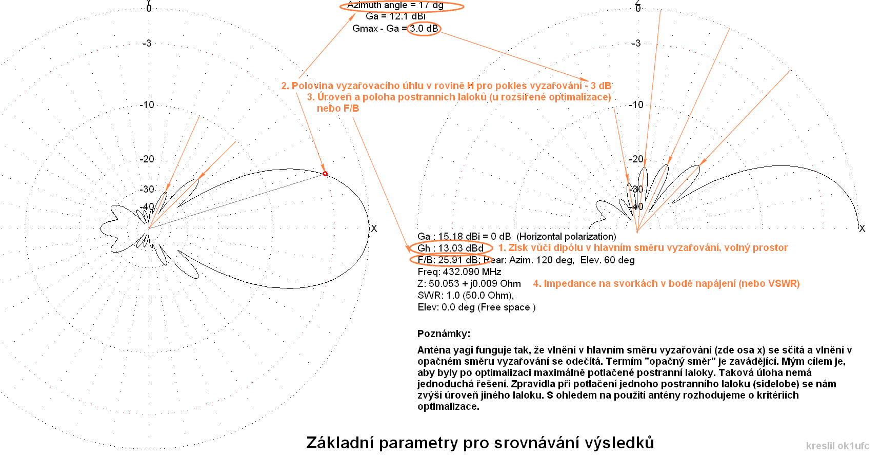 Základní parametry pro srovnávání výsledků provedených optimalizací jsou rovněž důležité. Proto pro ilustraci uvádím na dalším obrázku, které parametry to jsou. Úmyslně neuvádím výpočty G/T žádnou metodou, ale zcela určitě se vrátím v některém z dalších článků k energetickým popisům postranních laloků (sidelobes). V tomto popisu si však zjednoduším ilustraci pouze jejich okótováním v obou rovinách: