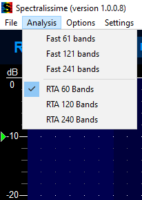 analýz (Fast a RTA) a umožňuje rozdělit akustické pásmo na 20 až